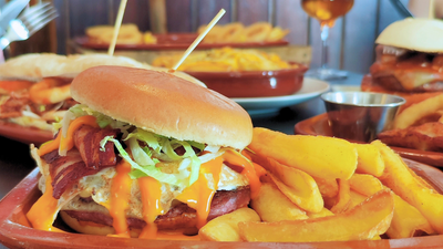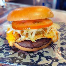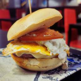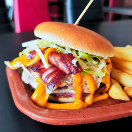 Con queso, cebolla, lechuga, tomate, bacon y huevo a la plancha; con pan brioche. Puedes elegir pan sin gluten en las opciones si lo necesitas. Alérgenos: huevo y lactosa