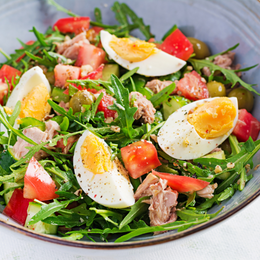 Lechuga, tomate, cebolla, espárragos, huevo cocido, atún y aceitunas. Alérgenos: huevo y pescado