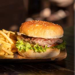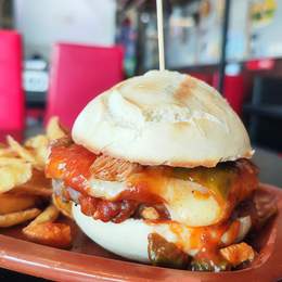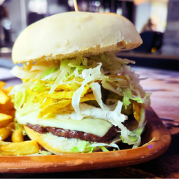 Con pan brioche, carne retinto, queso, lechuga, huevo a la plancha, bacon, cebolla y nuestra salsa casera Buffalo (picante). Alérgenos: gluten, lactosa, huevo, sulfitos y pescado. Las hamburguesas no vienen con patatas de guarnición