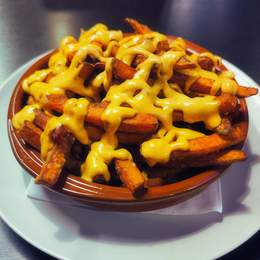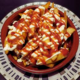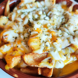 Patatas DIP con nata, queso cheddar, queso emmental, orégano y delicioso bacon ahumado. Alérgenos: lactosa y huevo