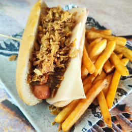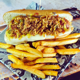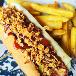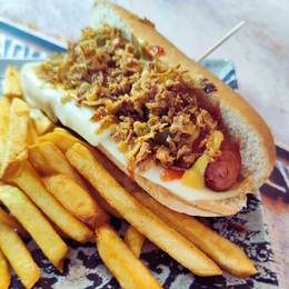 Perrito caliente con queso, ketchup, mostaza, pepinillos, salsa brava y cebolla crujiente. Los perritos no van acompañados de patatas. Alérgenos: gluten, lactosa y soja