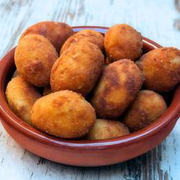 Surtido de ocho croquetas a elección del chef. ¿No te decides por un sabor en concreto? ¡Déjate sorprender por nuestras croquetas! Alérgenos: huevo, leche, gluten, apio, soja