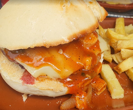 Con pan mollete, carne de ternera y cerdo, queso, tomate, huevo a la plancha y nuestra nueva mezcla de pollo, lechuga y mayonesa. Alérgenos: lactosa, huevo, sulfitos y gluten (carne). Las hamburguesas no vienen con patatas de guarnición