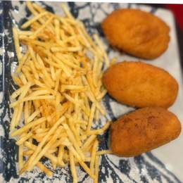 5 croquetas súper jugosas acompañadas de patatas paja. Elige entre: Secreto y miel, serranito, pollo al curry, arroz negro, merluza y gambas, cocido, jamón, verduras. Alérgenos: gluten, lactosa, soja, pescado y apio.