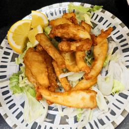 Ración de choco frito de la Bahía de Cádiz. Alérgenos: huevo, gluten, pescado