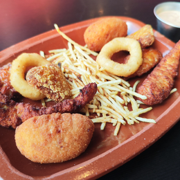 Surtido para 2 personas de triángulos de queso, croquetas, lagrimitas, alitas fritas y aros de cebolla. Con salsa mayo kimchi y patatas paja. Alérgenos: gluten, lactosa, soja, huevo, apio y mostaza