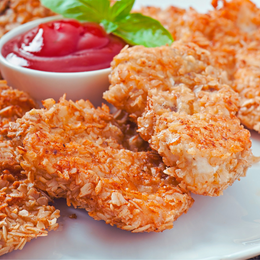 Filete de pollo, queso y huevo. Alérgenos: gluten, lactosa y huevo