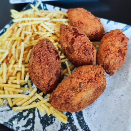 10 croquetas súper jugosas acompañadas de patatas paja. Elige entre: Secreto y miel, serranito, pollo al curry, arroz negro, merluza y gambas, cocido, jamón, verduras. Alérgenos: gluten, lactosa, soja, pescado y apio.