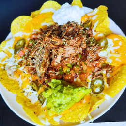 Con base de pico de gallo, frijoles, jalapeños, selección de quesos y especias, con guacamole y nata agria para dippear. Cubiertos de pulled pork casero hecho a fuego lento. Alérgeno: lactosa