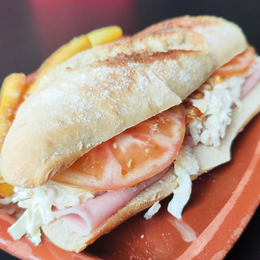 Filete de pollo, pimiento, jamón serrano y tomate natural. Alérgenos: gluten