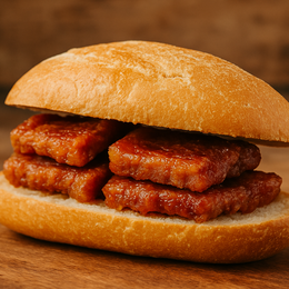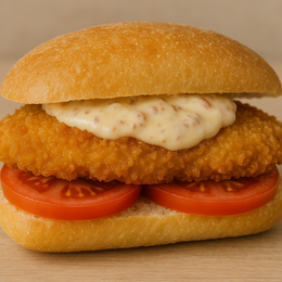 Pollo rebozado, tomate en rodajas y una deliciosa salsa umami de bacon