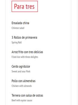 3 rollos de primavera, 1 ensalada china, 1 arroz frito con tres delicias, 1 cerdo agridulce, 1 pollo con almendras, 1 ternera con salsa de ostras