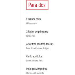 1 ensalada china, 2 rollos de primavera, 1 arroz frito con tres delicias, 1 cerdo agridulce, 1 pollo con almendras