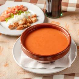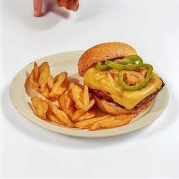Bacon, queso mozzarella, pimiento frito, cebolla frita, tomate a la parrilla, salsa Alfredo's Barbacoa, especias de pizza y orégano, con patatas fritas.