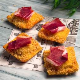 Crujiente raviolones artesanos rellenos de masa de croqueta de jamón ibérico.