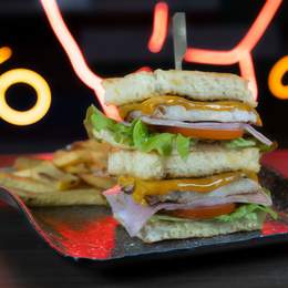 Jugoso pastrami de ternera ahumado con pepinillos agridulces, rúcula, mostaza de Dijon entre dos rebanadas de pan brioche tostado. Acompañado de patatas fritas.