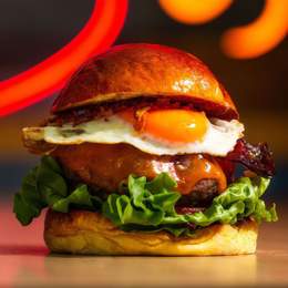 Nuevo brioche potato, patty de 180gr de carne dry aged, queso cheddar ahumado, tomate natural, lechuga batavia, bacón crujiente, pepinillo agridulce, cebolla crunchy y huevo a la plancha, acompañada de patatas.