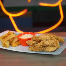 Fingers de pollo crujientes acompañados de patatas fritas con salsa de miel y mostaza.