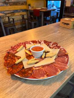 Con tumaca y picos, compuesto de chorizo y salchichón cular, lomo y jamón ibérico de bellota y nuestro queso curado de oveja.