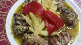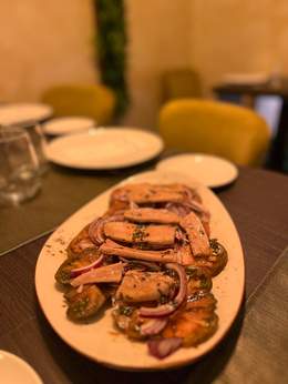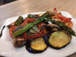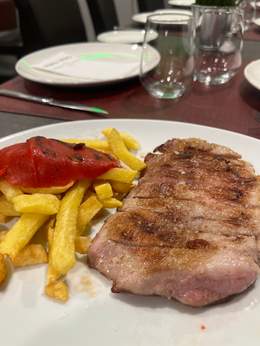 Deliciosa carne de entraña, secreto ibérico, tira argentina, chorizo criollo acompañado con pimientos asados y patatas.