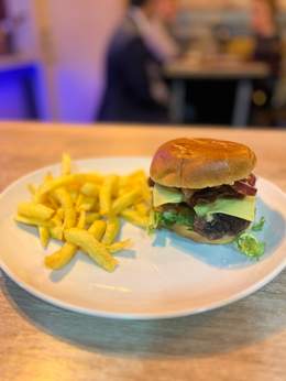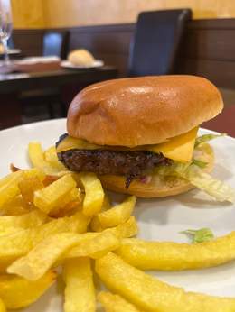 La clásica, elaborada con 175grms de carne de res, lechuga, tomate, queso y beicon, salsa de miel y mostaza y acompañada de patatas fritas.