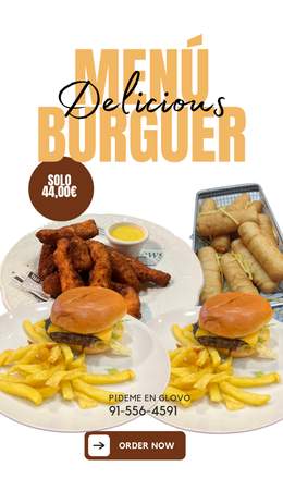 Comparte tus entrantes favoritos y disfruta de una deliciosa hamburguesa con quien quieras ademas la bebida y el postre están incluidas en este súper menú.