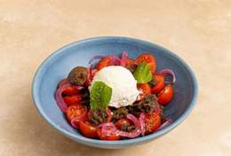 Jugosos cortes de carne de ternera picada en casa, especias griegas y un suave toque picante, asadas a la parrilla. Con pan de pita, ensalada, huevo a la plancha opcional y salsa a elegir. Contiene gluten (pan).