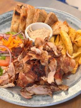 Con pan de pita o patatas fritas, ensalada y salsa tzatziki. Contiene gluten (pan) y lácteos
