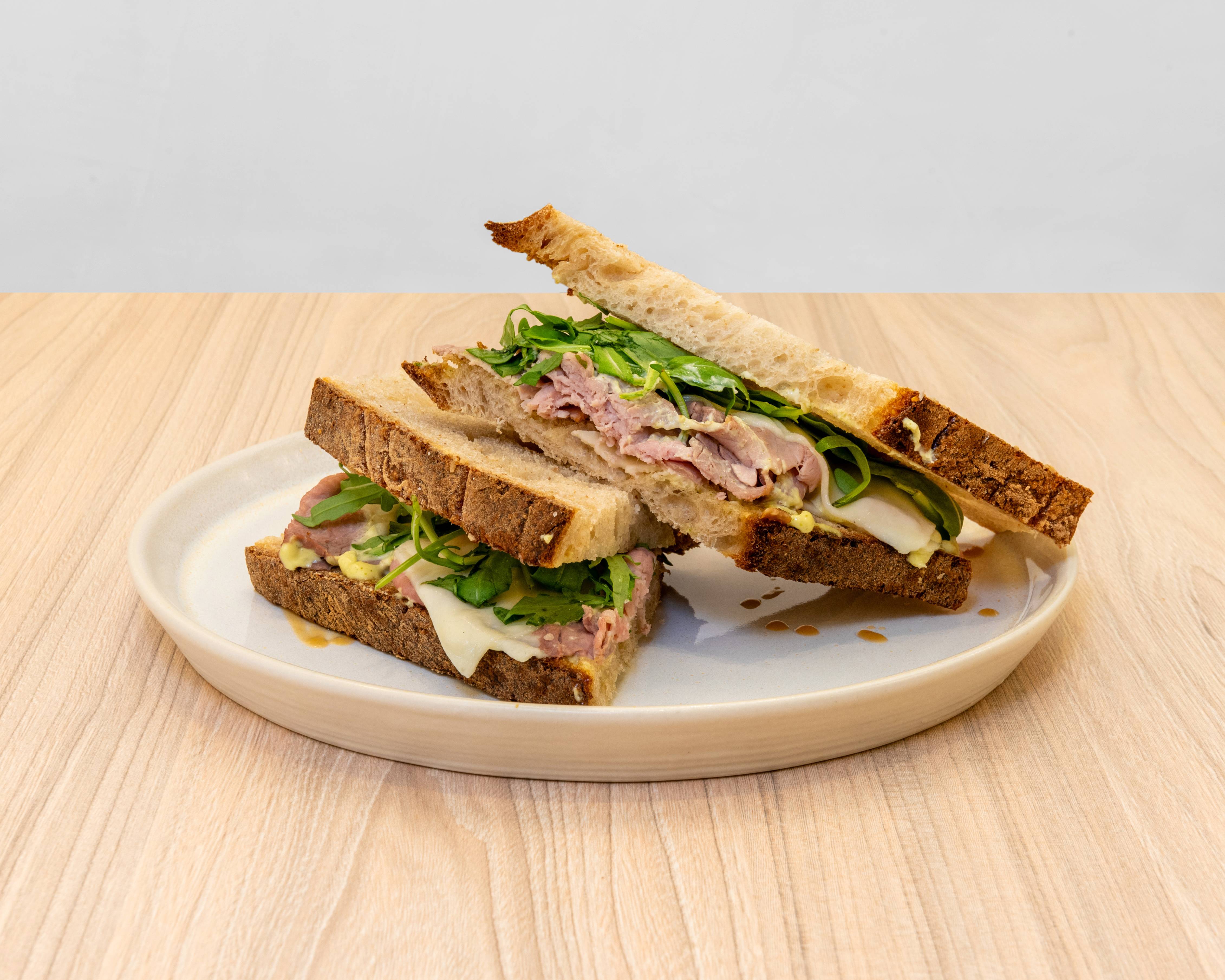 Roastbeef, queso, rúcula, pepino encurtido, mayo cilantro, pan de masa madre y gravy