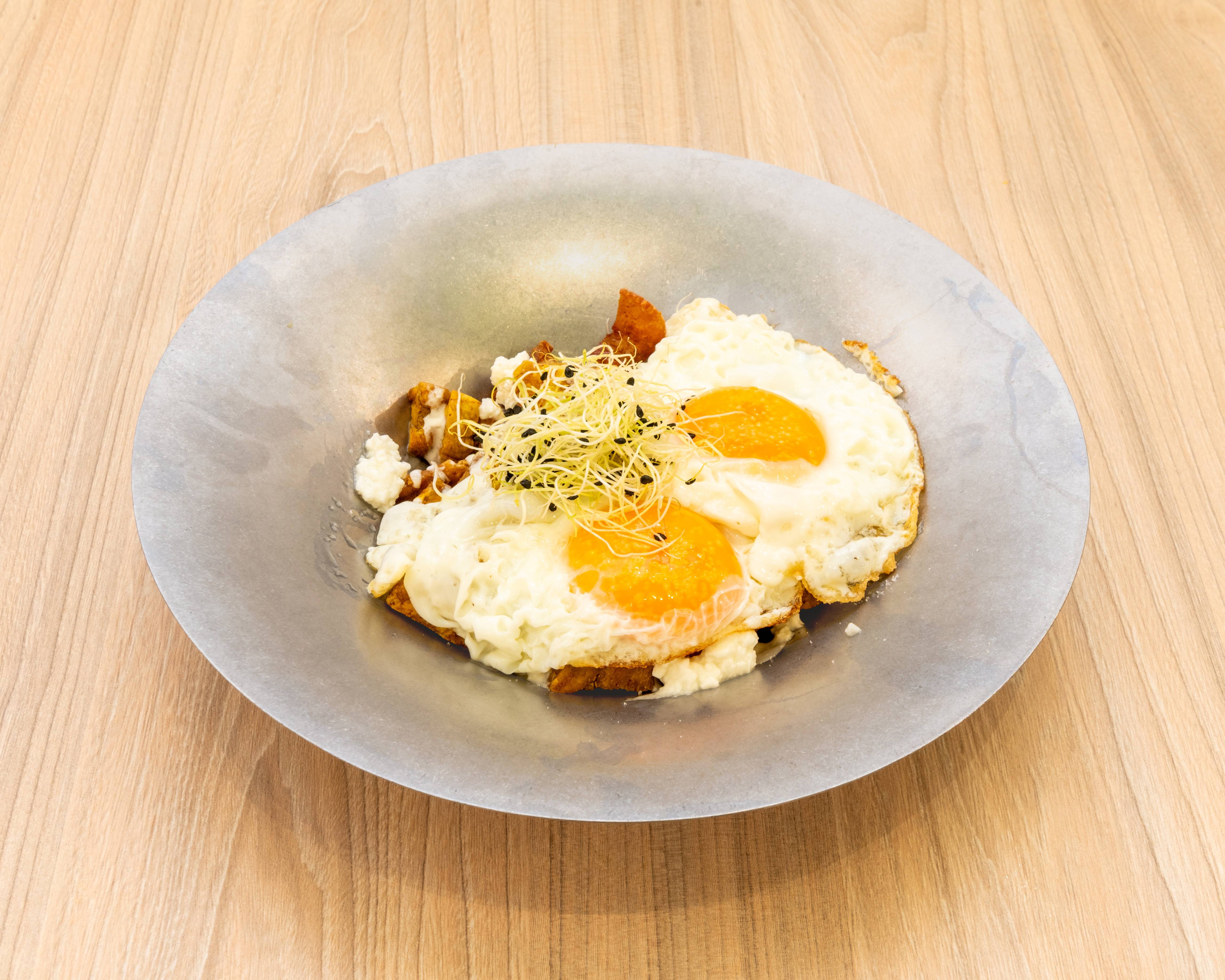 Huevos rotos con plátano macho, salsa de queso, 2 huevos, queso fresco, torreznos y brotes de cebolla