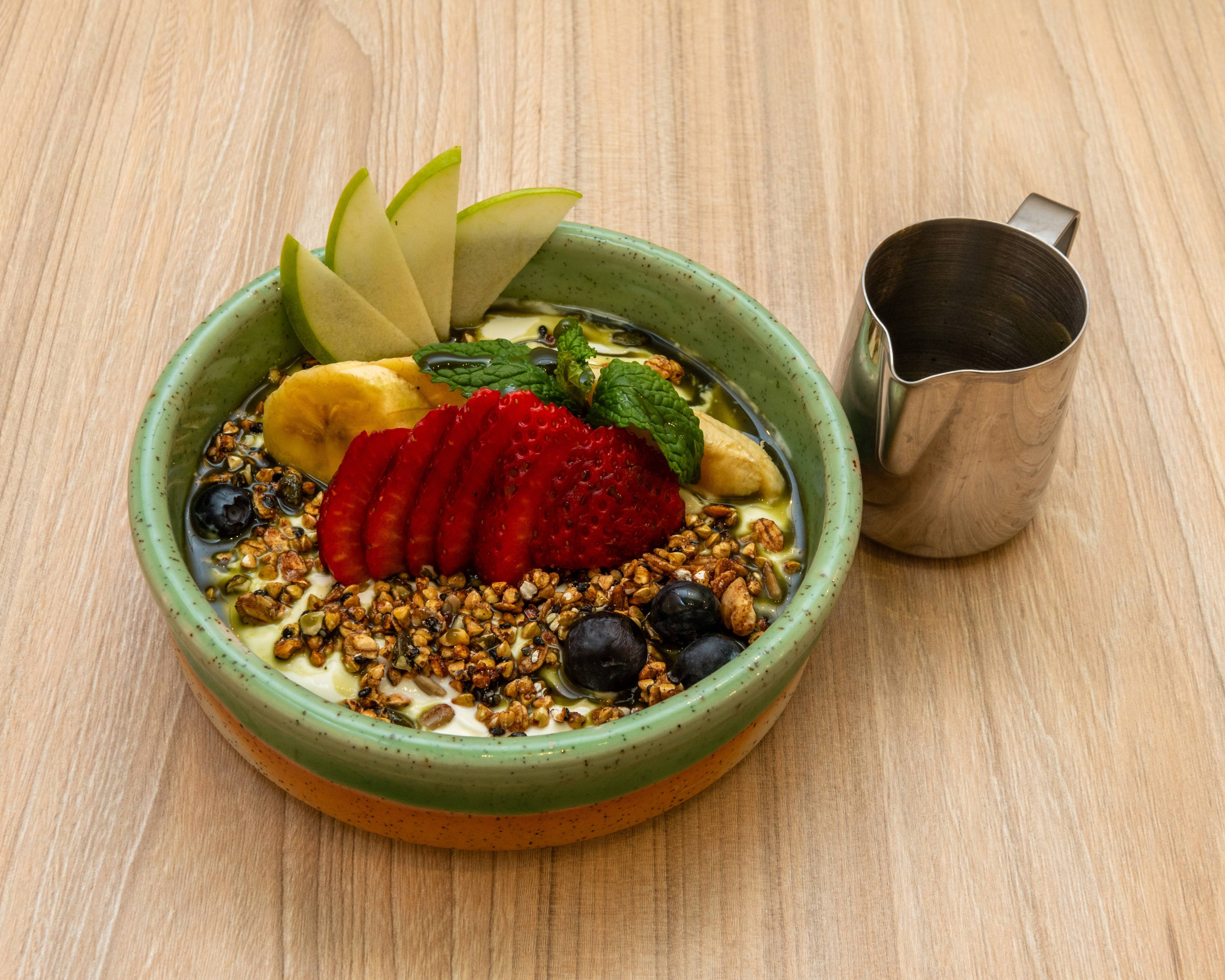 Yogur griego, granola de la casa, frutas de temporada y miel casera de Matcha