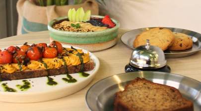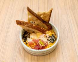 Yogur griego especiado, huevos pochados, pipas con sriracha, cebolla encurtida, ajonjolí, mantequilla spicy Kläre y pan masa madre