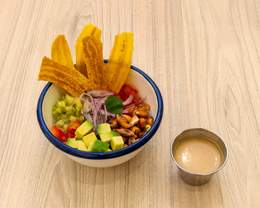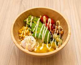 Dúo de arroz, cherrys asados, cacahuetes especiados, piña encurtida, aguacate, edamame y huevo poché