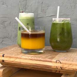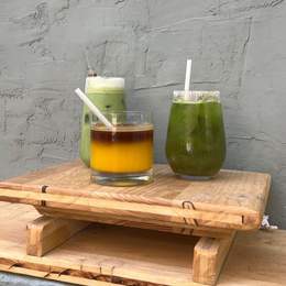 Matcha, limón, agua con gas, sirope de mojito y agave.