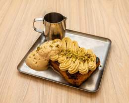 Torrija de brioche, crema de pistacho Kläre, espuma de mascarpone y café, virutas de chocolate blanco, pistacho troceado y miel de café de especialidad
