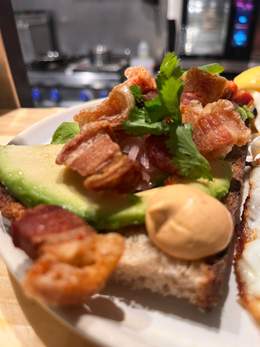 Aguacate, torreznos crocantes, cebolla encurtida y mayochipotle