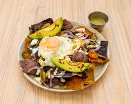 Totopos de maíz, salsa verde tatemada, salsa de queso, crema de frejoles, aguacate, queso fresco, huevo, cebolla, cilantro y jalapeños (ligeramente picante)