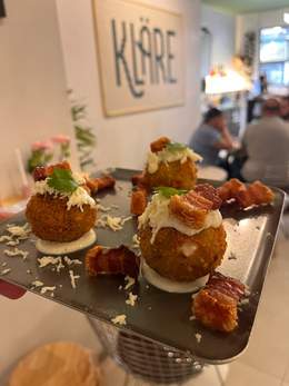 3 Croquetas de plátano macho rellenas de bechamel y queso, torreznos, salsa de queso, cilantro y huevo frito