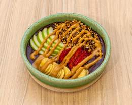 Blend de acai, maracuyá y banana con frutas de temporada, mantequilla de maní y granola de la casa