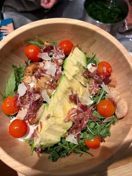 Hojas verdes con dressing de tzatziki, aguacate, tomates asados y virutas de queso parmesano, jamón ibérico y pan de masa madre