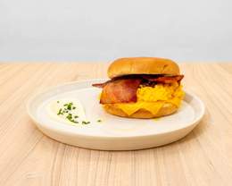 Pan brioche, huevos revueltos, tocino glaceado en maple, cheddar, mermelada de cebolla y tocino, mayo-ajo, cebollín
