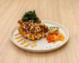 Korean Fried Chicken, gofre, salsas chipotle y tzatziki, kale crunchy y kimchi