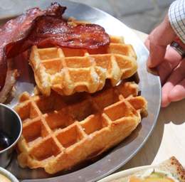 Gofres con maple, huevo frito y tocino glaceado en maple
