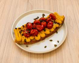 Hummus casero de calabaza asada, cherrys confitados con ajo y tomillo, pipas de calabaza con sriracha y oliva de pesto