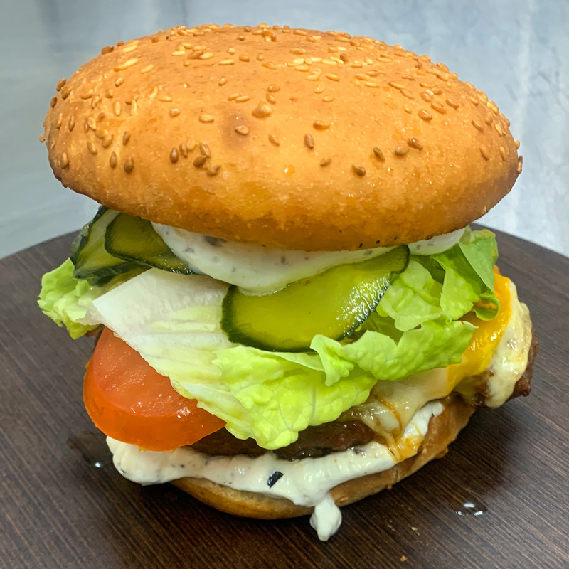 Carne Vaca nacional (240 g.), con empanado panko, salsa de tomate mediterráneo homemade, mozzarella, gouda, cebolla caramelizada, bacon ahumado natural, salsa BBQ craft, acompañado de patatas fritas naturales, 3 min de horno a 180ºC nos mejora, dependemos del reparto
