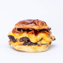 Doble smash burger, cheddar, bacon, pepinillo, cebolla picada y mayo chipotle en pan brioche