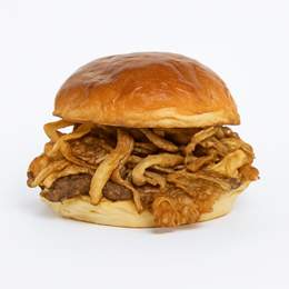 Smash burger, pulled pork, cebolla frita casera a la cerveza, cheddar, pepinillo y salsa barbacoa