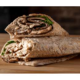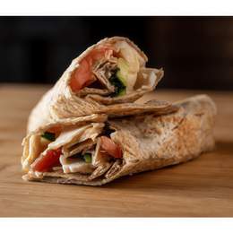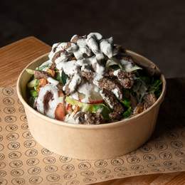 tiras de solomillo shawarma. tomates. pepino. rabano. cebolla. menta. mezcla de ensalada. crackers. salsa tahini. salsa makan.