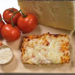 Un trozo de Pizza Margherita de masa alta crujiente por fuera y suave por dentro