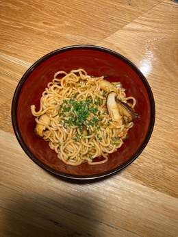Con fideos chuka, verduras de temporada y aliño de sésamo y tahini.